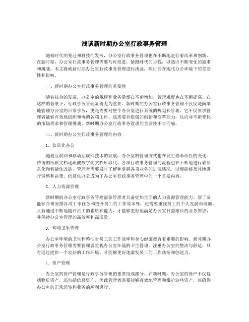 浅谈新时期办公室行政事务管理新时期办公室行政事务管理在不断变革与进步中,适应了时代发展的需求和办公室环境的改变。