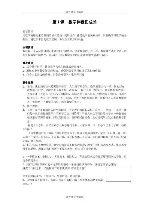 华师大版数学七年级上册1.1《数学伴我们成长》说课稿一. 教材分析华师大版数学七年级上册1.1《数学伴我们成长》是学生在进入初中阶段后接触到的第一节数学课,起着至关重要的引领作用。