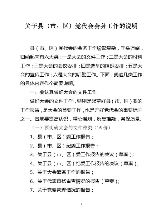 关于县(市、区)党代会会务工作的说明县(市、区)党代会的会务工作纷繁复杂,千头万绪,归纳起来有六大类:一是大会的文件工作;二是大会的材料工作;三是大会的会议安排;四是选举的组织安排;五是大会的宣传工作;六是大会的后勤工作。