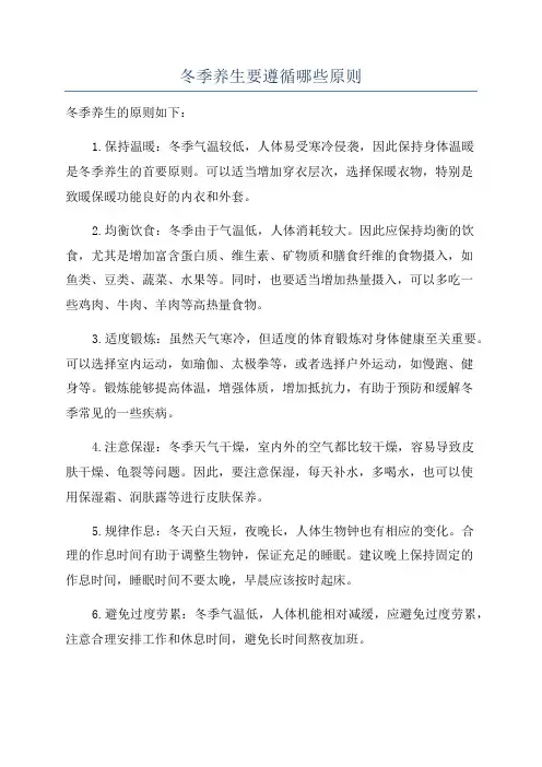 冬季养生要遵循哪些原则冬季养生的原则如下:1.保持温暖:冬季气温较低,人体易受寒冷侵袭,因此保持身体温暖是冬季养生的首要原则。
