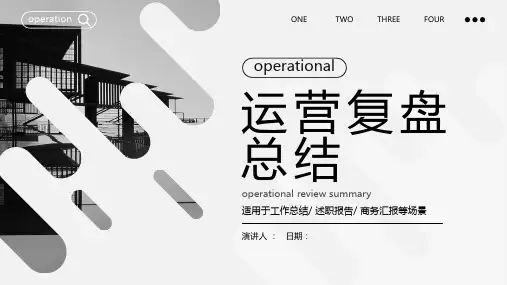 某公司运营部工作总结汇报(PPT4)•引言•运营部工作概况•运营部工作成果与亮点•运营部工作不足与挑战目录•运营部未来发展规划与目标•结束语引言01010204目的和背景回顾过去一年的工作成果和经验教训分析当前市场环境和竞争态势明确未来一年的工作目标和计划为公司决策层提供有价值的参考和建议03汇报范围01020304运营部整体工作概况重点业务运营情况数据分析和市场研究团队建设和管理运营部工作概况02运营经理数据分析师客户服务专员市场推广专员运营部总监运营部组织架构和人员配置制定并执行公司运营策略跟踪并评估运营效果,提出改进措施负责产品的上线、推广、运营及数据分析协调内外部资源,优化运营流程运营部工作职责和流程与市场部紧密合作,共同制定市场推广计划与销售部配合,提供运营数据支持,协助完成销售目标与技术部协同工作,确保产品功能和性能满足用户需求与客服部沟通,及时了解用户反馈,提升用户体验运营部与其他部门的协作关系运营部工作成果与亮点03运营数据分析及优化数据监控与分析建立了完善的数据监控体系,实时跟踪和分析关键运营指标,如用户活跃度、留存率、转化率等,为决策提供了有力支持。