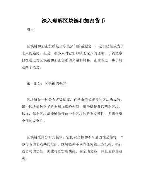 一、区块链和比特币的定义及背景为了更好地理解区块链和比特币之间的联系,首先需要明确它们各自的定义和背景。