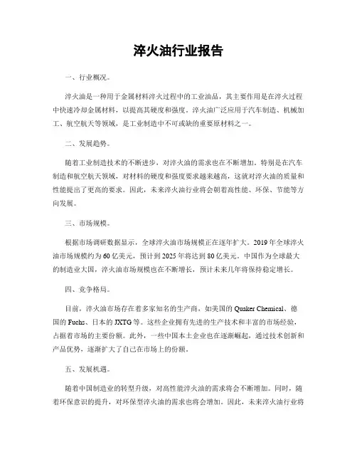 一、淬火油的定义和分类淬火油是指用于金属材料淬火过程中作为冷却介质的液体。