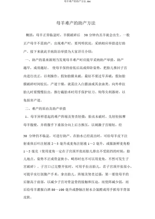 二、难产的原由及助产举措1、母羊异样惹起的难产阵缩及努责轻微:胎衣未破时,先轻轻按摩母羊腹壁,并将腹手下垂部分向上后方推压,以刺激子宫缩短,经30分钟仍不临盆,可进行助产。
