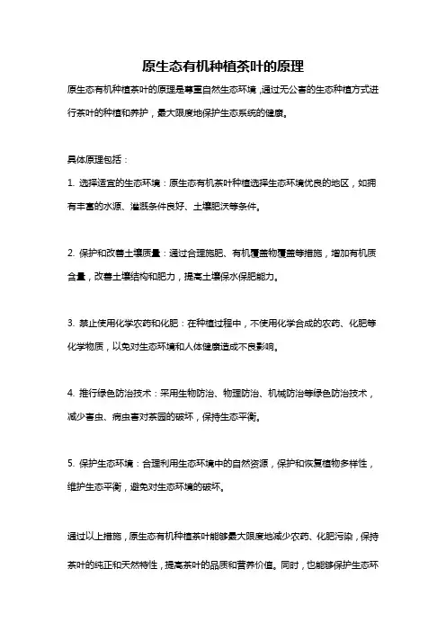 二、茶叶有机栽培技术的原则及要点茶叶有机栽培技术的原则是以自然为师,尊重生态环境,减少农药、化肥的使用,提高茶叶的养分密度、品质和安全性。