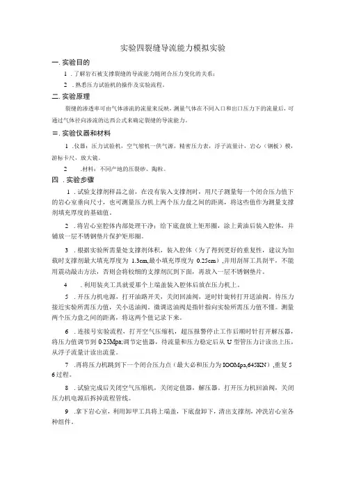 三、实验装置和流程1. 实验装置实验装置主要由以下部分组成: - 岩心模型:模拟地下岩层,用于注入支撑剂和测量裂缝导流能力。