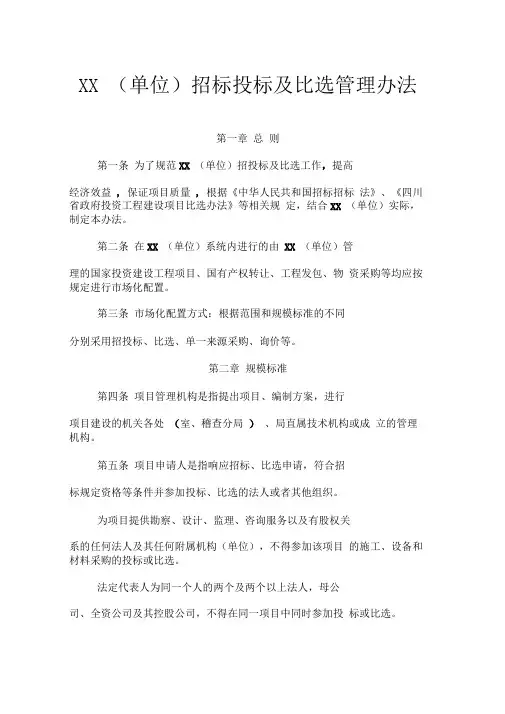 XX (单位)招标投标及比选管理办法第一章总则第一条为了规范XX (单位)招投标及比选工作,提高经济效益, 保证项目质量, 根据《中华人民共和国招标招标法》、《四川省政府投资工程建设项目比选办法》等相关规定,结合XX (单位)实际,制定本办法。