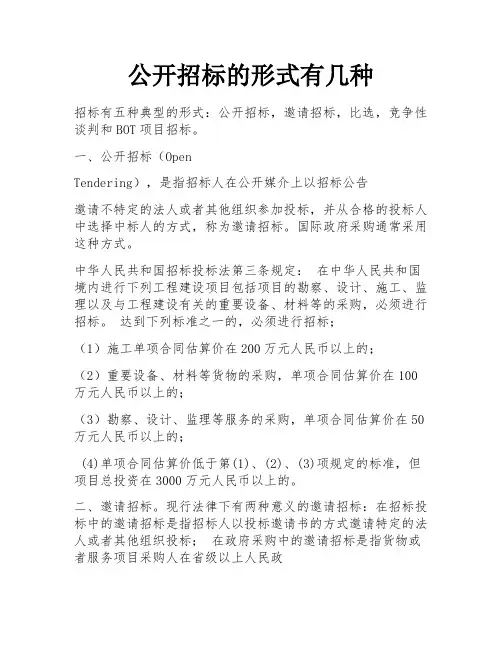 公开招标的形式有几种招标有五种典型的形式:公开招标,邀请招标,比选,竞争性谈判和BOT项目招标。