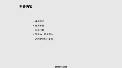 出血而中转开腹,所以应随时备好开腹器械和敷料,一旦 中转开腹,巡回护士和洗手护士做到忙而不乱,应付自如, 迅速清理术中所用物品,准确清点新添加的器械、缝针和 纱布,并做好记录,保证中转开腹手术的迅速进行。