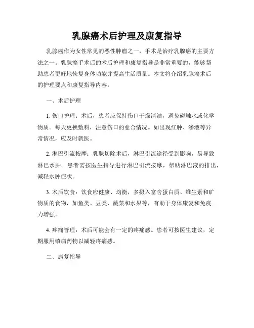 一、乳腺癌术后健康教育的内容1. 术后护理:术后的患者需要进行特殊的护理,包括伤口的清洁和换药、引流管的管理等。