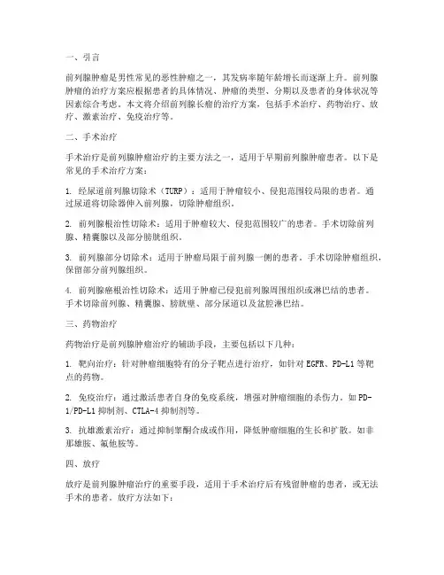 三、药物治疗药物治疗是前列腺肿瘤治疗的辅助手段,主要包括以下几种:1. 靶向治疗:针对肿瘤细胞特有的分子靶点进行治疗,如针对EGFR、PD-L1等靶点的药物。