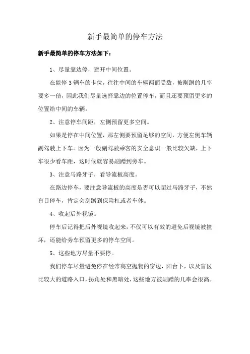 1.选择泊车位置:在选择泊车位置时,需要考虑车辆的长度和宽度,以及周围的环境。