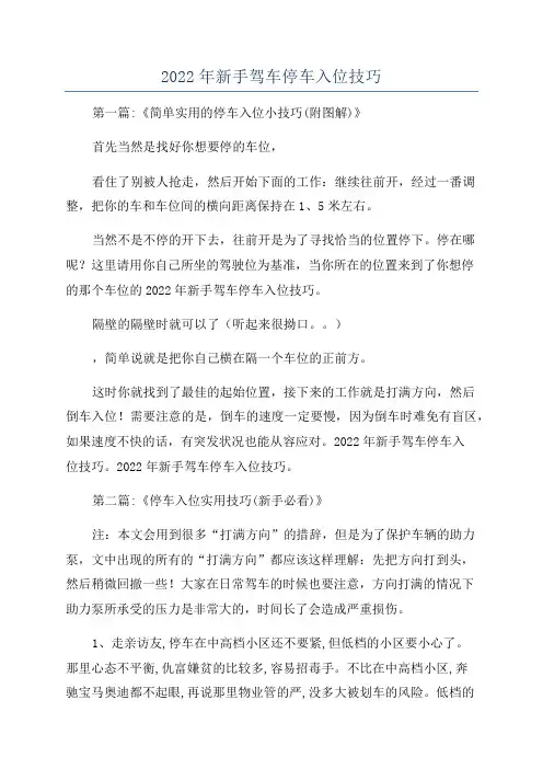 2022年新手驾车停车入位技巧第一篇:《简单实用的停车入位小技巧(附图解)》首先当然是找好你想要停的车位,看住了别被人抢走,然后开始下面的工作:继续往前开,经过一番调整,把你的车和车位间的横向距离保持在1、5米左右。
