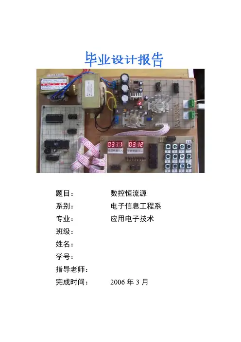 编号毕业设计(2013 届本科)题目:数控恒流源的设计与制作学院:物理与机电工程学院专业:电子信息科学与技术作者姓名:指导教师:职称:完成日期:2013 年月日二〇一三年六月目录河西学院本科生毕业论文(设计)诚信声明 (1)河西学院本科生毕业论文(设计)开题报告 .................................................... 错误!未定义书签。