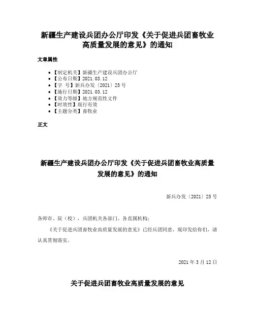 国务院办公厅关于促进畜牧业高质量发展的意见文章属性•【制定机关】国务院办公厅•【公布日期】2020.09.14•【文号】国办发〔2020〕31号•【施行日期】2020.09.14•【效力等级】国务院规范性文件•【时效性】现行有效•【主题分类】畜牧业正文国务院办公厅关于促进畜牧业高质量发展的意见国办发〔2020〕31号各省、自治区、直辖市人民政府,国务院各部委、各直属机构:畜牧业是关系国计民生的重要产业,肉蛋奶是百姓“菜篮子”的重要品种。