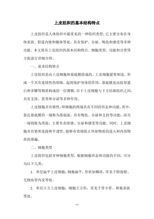 二、上皮组织的结构特点上皮组织的结构特点主要包括以下几个方面:1. 细胞层厚度不一上皮组织的细胞层厚度不一,有的只有一层细胞,如肺泡上皮,有的则有多层细胞,如表皮。