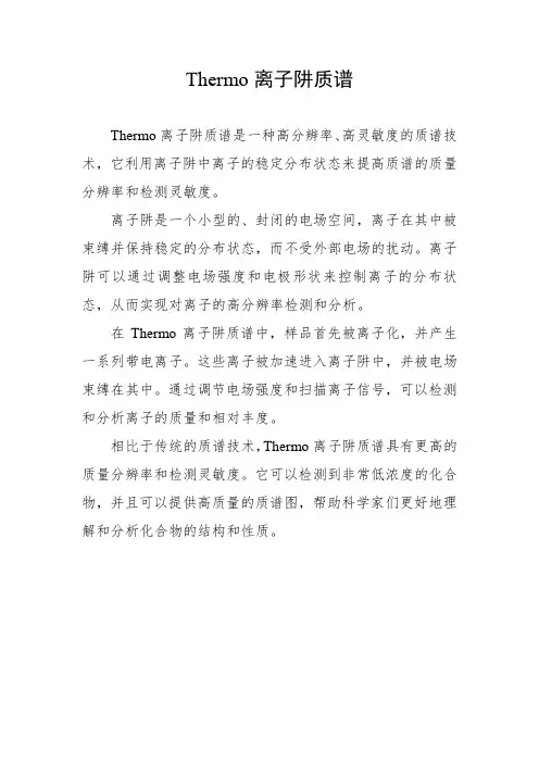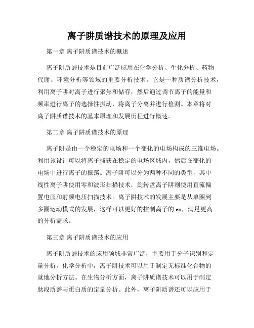 离子阱质谱技术的原理及应用第一章离子阱质谱技术的概述离子阱质谱技术是目前广泛应用在化学分析、生化分析、药物代谢、环境分析等领域的重要分析技术。