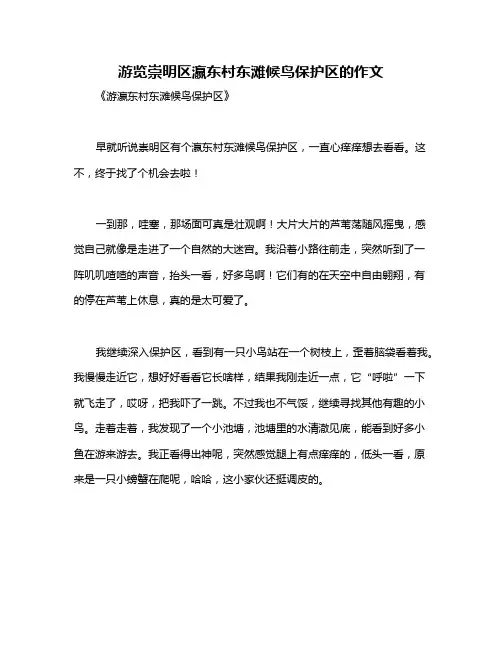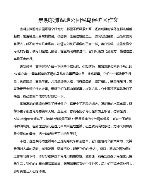 崇明东滩湿地公园候鸟保护区作文崇明东滩湿地公园可是个好地方,那里不仅风景如画,还有成群的候鸟在那儿翩翩起舞,简直就是大自然的舞台。