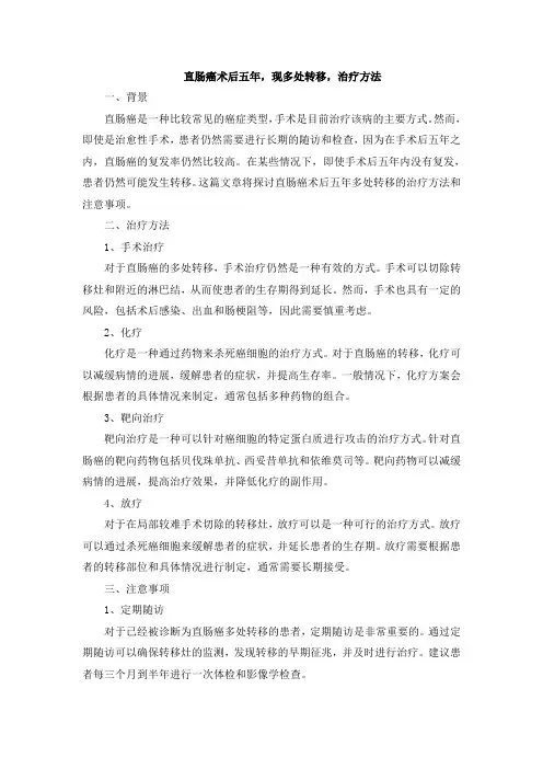 二、治疗方法1、手术治疗对于直肠癌的多处转移,手术治疗仍然是一种有效的方式。