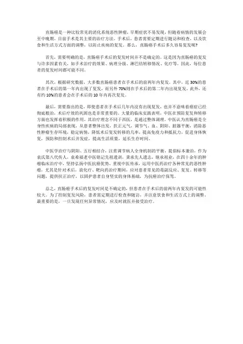 结直肠癌术后局部复发率为3%~32%,复发时间主要为术后2年内,高峰为6~12个月。