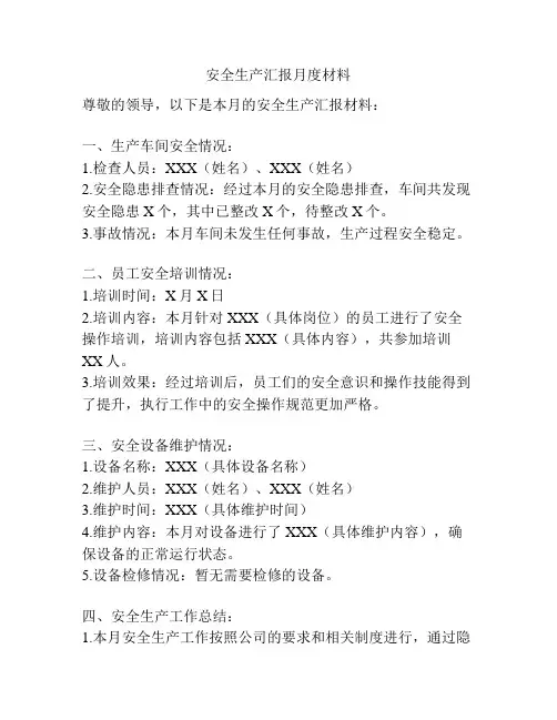 三、安全生产培训情况本月公司开展了安全生产培训,共培训员工XX人次,包括安全操作规程、应急预案、安全标准等内容。