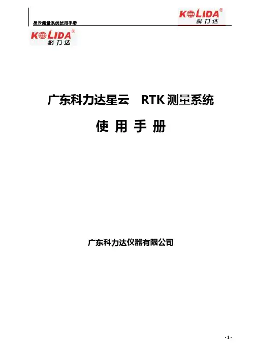 广东科力达星云RTK测量系统使用手册广东科力达仪器有限公司目录目录 (1)第一章概述 (1)§1.1引言 (1)§1.2产品功能及亮点 (1)第二章星云测量系统介绍 (3)§2.1整体介绍 (3)§2.2星云主机介绍 (4)§2.2.1主机外型 (4)§2.2.2结构与接口 (5)§2.2.3按键和指示灯 (6)§2.2.4星云按键功能介绍 (7)§2.3手簿介绍 (11)§2.3.2键盘及功能介绍 (11)§2.3.1手簿外观 (12)§2.4.2蓝牙连接 (13)§2.5主机配件介绍 (15)§2.5.1仪器箱 (15)§2.5.2电池及充电器 (15)§2.5.3差分电台天线 (16)§2.5.4数据线 (17)§2.5.5其他配件 (17)第三章仪器架设与配置 (17)§3.1静态作业 (17)§3.2RTK作业(外置电台1+1模式) (20)§3.2.1外置电台基准站架设 (20)§3.2.2启动基准站 (21)§3.2.3架设移动站 (23)§3.2.4设置移动站 (24)§3.3RTK作业(内置电台1+1模式) (26)§3.3.1内置电台基站架设 (26)§3.3.2启动基准站 (26)§3.3.3架设移动站 (28)§3.3.4设置移动站 (29)§3.3RTK作业(网络1+1模式) (32)§3.3.1基准站和移动站的架设 (32)§3.3.2基准站设置 (32)§3.3.3移动站设置 (34)§3.4RTK作业(网络CORS模式) (37)§3.4.1移动站的架设 (37)§3.4.2移动站设置 (37)第四章常见功能使用 (40)§4.1点测量 (40)§4.2点放样 (41)§4.3成果数据导出 (44)§4.4惯导功能使用 (45)§4.5WebUI网页配置 (47)§4.6固件升级 (48)4.6.1数据线升级 (48)4.6.2WebUI网页升级 (49)4.6.3工程之星在线升级 (51)§4.7天线高量取方式 (52)附录A星云测量系统技术指标 (53)附录B H6手簿技术指标 (55)附录C联系方式 (57)第一章概述阅读本章,您可以简单了解科力达公司及星云测量系统§1.1引言欢迎使用广东科力达仪器有限公司产品。