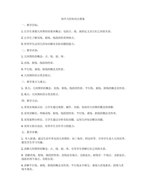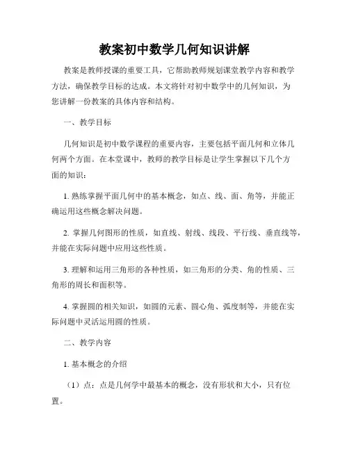 一、教学目标几何知识是初中数学课程的重要内容,主要包括平面几何和立体几何两个方面。