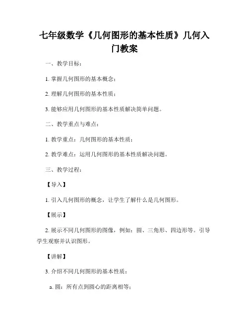 七年级数学《几何图形的基本性质》几何入门教案一、教学目标:1. 掌握几何图形的基本概念;2. 理解几何图形的基本性质;3. 能够应用几何图形的基本性质解决简单问题。