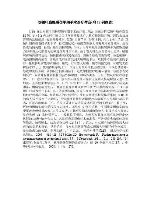 双额叶脑挫裂伤早期手术治疗体会(附12例报告)目的探讨双额叶脑挫裂伤早期手术的疗效。