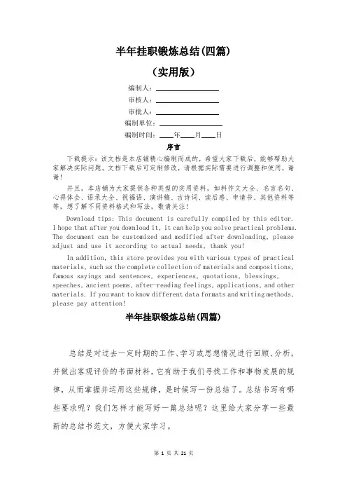 半年挂职锻炼总结(四篇)(实用版)编制人:__________________审核人:__________________审批人:__________________编制单位:__________________编制时间:____年____月____日序言下载提示:该文档是本店铺精心编制而成的,希望大家下载后,能够帮助大家解决实际问题。