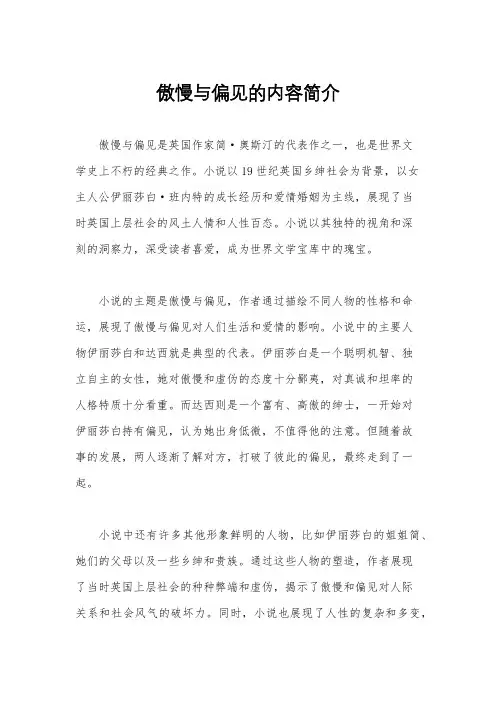 傲慢与偏见故事梗概《傲慢与偏见》是英国作家简·奥斯汀的代表作之一,也是世界文学史上具有重要地位的小说之一。