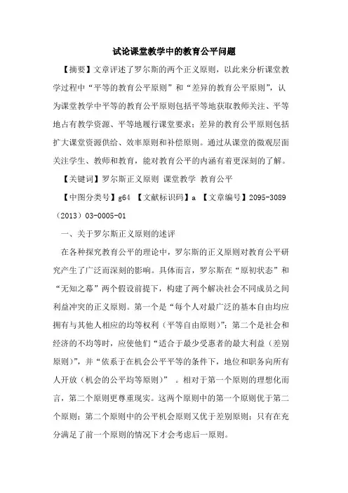 二、从“正义原则”看课堂教学公平的内容(一)关于课堂教学公平的一般理解许多涉及教育公平问题都以罗尔斯的理论为依据,不仅涉及到宏观的制度建设,也转向了微观领域——课堂教学公平的关注。