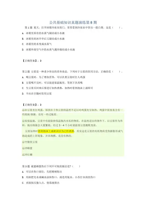 A. 冰箱里原有的水蒸气凝结成小水滴B. 冰箱里的冰升华后又凝结成小水滴C. 冰箱里的水变成水蒸气D. 冰箱外部空气中的水蒸气遇冷凝结成小水滴【正确答案】:D第2题豆浆是一种老少皆宜的营养食品,下列对于豆浆的饮用方法,正确的是()。
