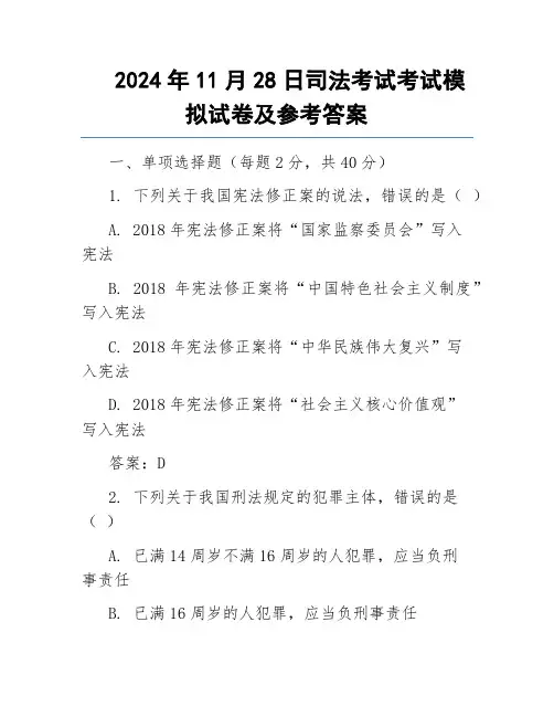 2024年11月28日司法考试考试模拟试卷及参考答案一、单项选择题(每题2分,共40分)1. 下列关于我国宪法修正案的说法,错误的是()A. 2018年宪法修正案将“国家监察委员会”写入宪法B. 2018年宪法修正案将“中国特色社会主义制度”写入宪法C. 2018年宪法修正案将“中华民族伟大复兴”写入宪法D. 2018年宪法修正案将“社会主义核心价值观”写入宪法答案:D2. 下列关于我国刑法规定的犯罪主体,错误的是()A. 已满14周岁不满16周岁的人犯罪,应当负刑事责任B. 已满16周岁的人犯罪,应当负刑事责任C. 已满14周岁不满18周岁的人犯罪,可以从轻或者减轻处罚D. 已满75周岁的人犯罪,可以从轻或者减轻处罚答案:A3. 下列关于我国民事诉讼法的说法,错误的是()A. 民事诉讼实行地域管辖原则B. 民事诉讼实行级别管辖原则C. 民事诉讼实行协议管辖原则D. 民事诉讼不实行专属管辖原则答案:D4. 下列关于我国刑事诉讼法的说法,正确的是()A. 刑事诉讼实行合议制度B. 刑事诉讼实行陪审制度C. 刑事诉讼实行辩护制度D. 刑事诉讼不实行回避制度答案:C5. 下列关于我国合同法的说法,错误的是()A. 合同是平等主体之间设立、变更、终止民事权利义务关系的协议B. 合同应当具备法律规定的形式C. 合同的成立以当事人意思表示一致为原则D. 合同的生效以当事人意思表示不一致为原则答案:D(以下题目略)二、多项选择题(每题3分,共30分)11. 下列关于我国宪法基本原则的说法,正确的有()A. 人民主权原则B. 法律面前人人平等原则C. 尊重和保障人权原则D. 民主集中制原则答案:ABCD12. 下列关于我国刑法规定的犯罪,属于纯正身份犯的有()A. 贪污罪B. 受贿罪C. 非法拘禁罪D. 滥用职权罪答案:AB13. 下列关于我国民事诉讼法的说法,正确的有()A. 民事诉讼实行简易程序B. 民事诉讼实行普通程序C. 民事诉讼实行特别程序D. 民事诉讼实行督促程序答案:ABCD14. 下列关于我国刑事诉讼法的说法,正确的有()A. 刑事诉讼实行侦查制度B. 刑事诉讼实行起诉制度C. 刑事诉讼实行审判制度D. 刑事诉讼实行执行制度答案:ABCD15. 下列关于我国合同法的说法,正确的有()A. 合同的订立应当遵循诚实信用原则B. 合同的履行应当遵循全面履行原则C. 合同的变更应当遵循公平原则D. 合同的解除应当遵循合法原则答案:ABCD(以下题目略)三、案例分析题(每题10分,共20分)26. 甲公司因业务需要,与乙公司签订了一份购销合同。