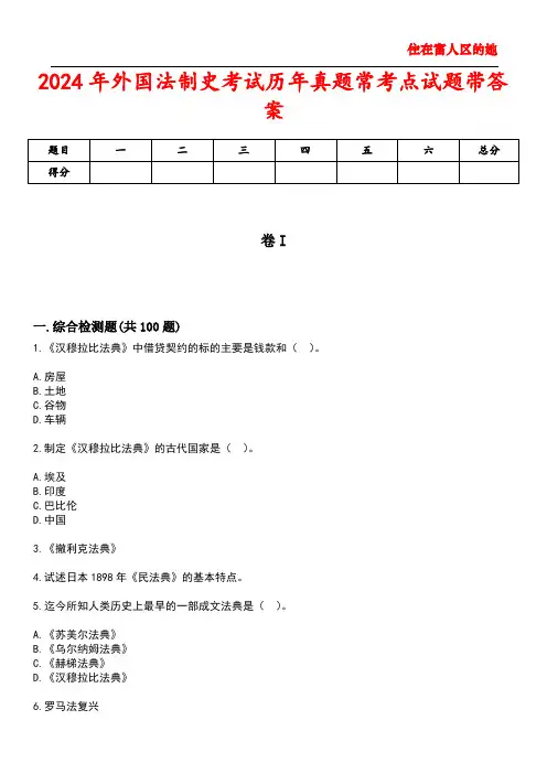 2024年外国法制史考试历年真题常考点试题带答案卷I一.综合检测题(共100题)1.《汉穆拉比法典》中借贷契约的标的主要是钱款和()。