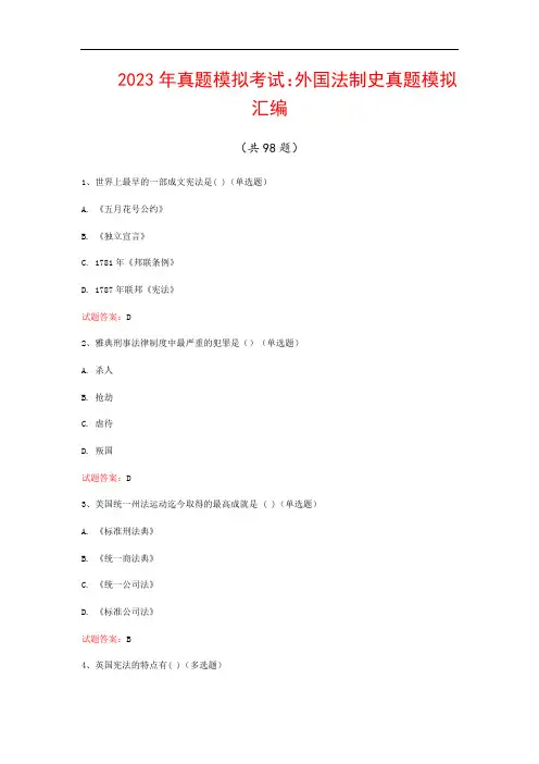2023年真题模拟考试:外国法制史真题模拟汇编(共98题)1、世界上最早的一部成文宪法是( )(单选题)A. 《五月花号公约》B. 《独立宣言》C. 1781年《邦联条例》D. 1787年联邦《宪法》试题答案:D2、雅典刑事法律制度中最严重的犯罪是()(单选题)A. 杀人B. 抢劫C. 虐待D. 叛国试题答案:D3、美国统一州法运动迄今取得的最高成就是 ( )(单选题)A. 《标准刑法典》B. 《统一商法典》C. 《统一公司法》D. 《标准公司法》试题答案:B4、英国宪法的特点有( )(多选题)A. 不成文宪法B. 极强的历史延续性C. 内容具有不确定性D. 柔性宪法E. 条款最多试题答案:A,B,C,D5、法兰西第血共和国总统产生的方式是 ( )(单选题)A. 由选民间接选举B. 由选民直接选举C. 先是间接选举后改为直接选举D. 先是直接选举后改为问接选举试题答案:B6、《汉穆拉比法典》规定诉讼由私人提起,当事人负有完全的举证责任,法典规定可采信的证据不包括()(单选题)A. 证人证言B. 宣誓C. 神明裁判D. 决斗试题答案:D7、公元380年宣布基督教为罗马的国教的罗马皇帝是 ( )(单选题)A. 君士坦丁B. 狄奥多西C. 克洛维D. 哥列高利试题答案:B8、德国法西斯专政的根本大法是 ( )(单选题)A. 《保护德意志人民紧急条例》B. 《保护人民与国家条例》C. 《消除人民和国家痛苦法》D. 《德国改造法》试题答案:C9、罗马法中,仅适用于罗马公民的法律称为 ( )(单选题)A. 公法B. 私法C. 市民法D. 万民法试题答案:C10、在雅典的民主改革中,建立了公民可以就现行立法是否违反民主制度问题向陪审法庭提起申诉制度的执政官是()(单选题)A. 阿菲埃尔特B. 克里斯提尼C. 伯里克利D. 梭伦试题答案:A11、下列法律中,属于美国反托拉斯法的有 ( )(多选题)A. 《保护贸易及商业免受非法限制及垄断法》B. 《塔芙脱-哈特莱法》C. 《诺里斯拉瓜迪亚法》D. 《联邦贸易委员会法》E. 《罗伯逊—帕特曼法》试题答案:A,D,E12、德国法与法国法的差别是( )(多选题)A. 更多地保留了日耳曼法的因素B. 更注重法典的逻辑性、科学性C. 更强调国家对经济的干预D. 更多的自由主义因素E. 对罗马法大量的借鉴试题答案:A,B,C13、城市法中最为首要的内容是 ( )(单选题)A. 城市自治权B. 城市机关C. 城市管理D. 诉讼制度试题答案:A14、美国联邦最高法院的司法审查权产生于 ( )(单选题)A. 1787年宪法的明文规定B. 宪法修正案的规定C. “马布里诉麦迪逊”一案的判例D. 对英国普通法的继承试题答案:C15、下列各选项中,属婆罗门教基本教义的是 ( )(多选题)A. 吠陀天启B. 梵我一如C. 祭祀万能D. 业力轮回E. 婆罗门至上试题答案:B,D16、古印度法的婚姻家庭制度中,高等种姓男子和低等种姓女子的婚姻被视为()(单选题)A. 顺婚B. 内婚C. 逆婚D. 外婚试题答案:A17、基督教正式分裂为东西两大教派的时间是()(单选题)A. 476年B. 1054年C. 1295年D. 1640年试题答案:B18、《独立宣言》的主要起草人是( )(单选题)A. 托马斯·杰斐逊B. 林肯C. 卢梭D. 伏尔泰试题答案:A19、美国第一个社会保障方面的法律——《社会保障法》制定于 ( )(单选题)A. 1935年B. 1936年C. 1937年D. 1938年试题答案:A20、646年日本颁布诏书废除奴隶制度,按照中国隋唐封建集权国家的形式进行经济、政治改革,这次改革称为 ( )(单选题)A. 明治维新B. 大化革新C. 自由民权运动D. 天保改革试题答案:B21、迄今为止,美国国会通过的宪法修正案的总数是()(单选题)A. 26条B. 28条C. 30条D. 32条试题答案:B22、《法国民法典》的渊源主要有( )(多选题)A. 革命初期的各种民事立法和法制原则B. 革命前的王室法令C. 习惯法D. 罗马法E. 前巴黎高等法院的判决和教会法试题答案:A,B,C,D,E23、婆罗门教时期,较为重要的法经有( )(多选题)A. 《乔达摩法经》B. 《磐达耶那法经》C. 《阿帕斯檀跋法经》D. 《毗湿奴法经》E. 《罗摩衍那》试题答案:A,B,C,D24、罗马法学家把契约分为( )(多选题)A. 要物契约B. 口头契约C. 文书契约D. 诺成契约E. 买卖契约试题答案:A,B,C,D25、在法国,由非职业法官组成的法院是()(单选题)A. 行政法院B. 商事法院C. 简易法院D. 劳动法院试题答案:B26、在西欧“复兴”罗马法的运动中,起开创作用的法学派是 ( )(单选题)A. 评论法学派B. 人文主义法学派C. 注释法学派D. 历史法学派试题答案:C27、废除了原来由父亲单独对子女行使亲权的规定,改由父母双方其同对子女行使亲权的法律是( )(单选题)A. 《男女平等权利法》B. 《亲子关系改革法》C. 《继承权地位平等法》D. 《子女抚养法》试题答案:A28、古罗马法学家的活动具有实际应用性质,他们的任务有()(多选题)A. 调解B. 解答C. 编撰D. 诉讼E. 著述试题答案:B,C,D,E29、法西斯立法中,将女工从工厂赶回家庭,以扩充男工的劳动市场的法律是( )(单选题)A. 《企业劳工会议法》B. 《强制卡特尔法》C. 《德国商法典》D. 《失业缓和法》试题答案:D30、《美国宪法》明文规定的国会立法权称作 ( )(单选题)A. 默示权B. 释明权C. 明示权D. 沉默权试题答案:C31、取消原有的四个氏族部落的雅典执政官是()(单选题)A. 德拉古B. 梭伦C. 克里斯提尼D. 伯里克利试题答案:C32、日本《明治宪法》主要参考了下面哪一国的法律 ( )(单选题)A. 英国B. 法国C. 德国D. 美国试题答案:C33、约成于公元前2世纪—公元2世纪,古印度法制史上第一部较为正规的法律典籍是()(单选题)A. 《述祀氏法典》B. 《那罗陀法典》C. 《摩奴法典》D. 《布里哈斯帕提法