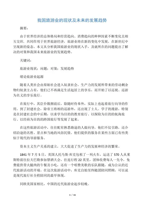 中国旅游业发展现状、趋势及对策分析目录内容摘要 (1)一、国内旅游业的发展现状 (2)(一)旅游规划的城市化现状 (2)(二)从旅游消费方式、水平和客源看现状 (2)(三)从旅游地域性看现状 (3)(四)从旅游服务看现状 (3)二、国内旅游业的发展趋势 (5)(一)旅游消费水平向高级发展 (5)(二)旅游人数稳步增长,有组织的团体将逐步增多 (6)(三)旅行路线由短途到长途发展 (6)(四)旅游方式多样化 (6)(五)国内旅游业在国民经济中的地位和作用日益加强 (7)三、发展国内旅游业的对策 (8)(一)在基础设施建设方面,要体现关心 (8)(二)加大旅游人才培养,提高旅游从业人员整体素质 (8)(三)健全协调机制、监督机制,保障旅游者的正当权益 (9)(四)在旅游点的宣传方面,要体现精心 (9)(五)促进产业融合,提高综合竞争力 (10)(六)放大社会功能,保障和改善民生 (10)(七)发挥地方优势特色,促进区域平衡发展 (10)(八)突出科技进步和创新的作用,注重发展方式转变 (11)四、结束语 (12)参考文献 (13)致谢 (14)内容摘要:旅游业具有“无烟产业”和“永远的朝阳产业”的美称,它已经和石油业、汽车业并列为世界三大产业。