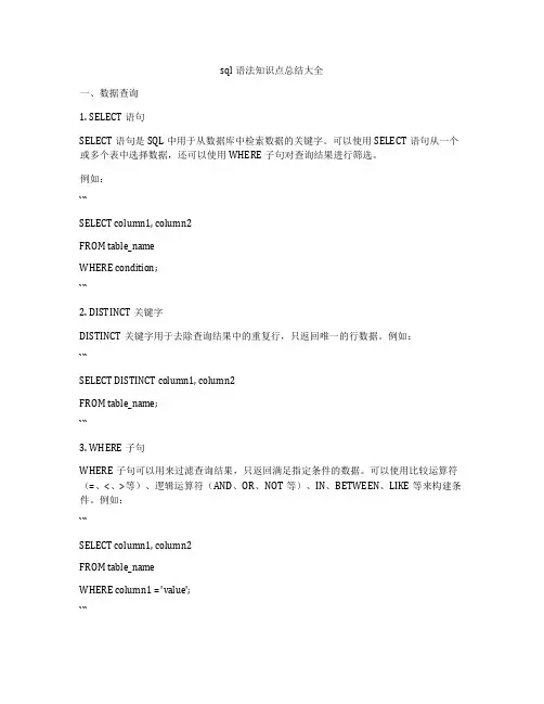 sql语法知识点总结大全一、数据查询1. SELECT语句SELECT语句是SQL中用于从数据库中检索数据的关键字。