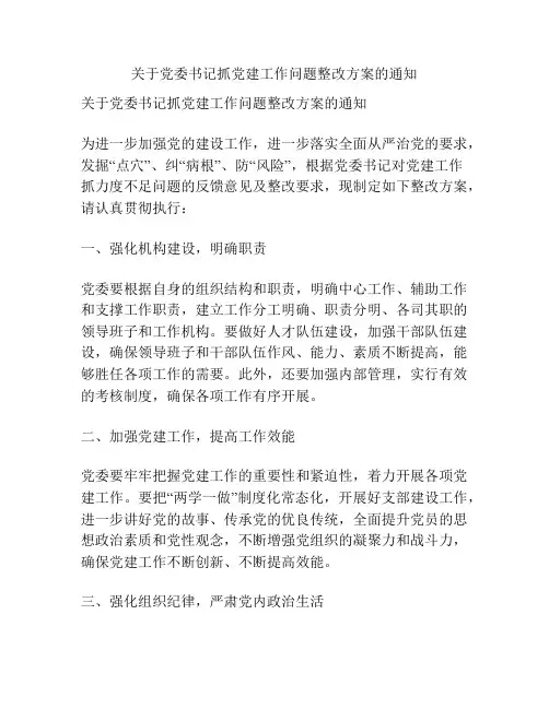 关于党委书记抓党建工作问题整改方案的通知关于党委书记抓党建工作问题整改方案的通知为进一步加强党的建设工作,进一步落实全面从严治党的要求,发掘“点穴”、纠“病根”、防“风险”,根据党委书记对党建工作抓力度不足问题的反馈意见及整改要求,现制定如下整改方案,请认真贯彻执行:一、强化机构建设,明确职责党委要根据自身的组织结构和职责,明确中心工作、辅助工作和支撑工作职责,建立工作分工明确、职责分明、各司其职的领导班子和工作机构。