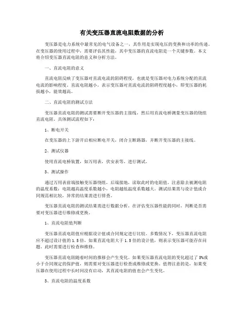 三、变压器高压侧直流电阻的合格标准1. 直流电阻的测试方法在进行变压器高压侧直流电阻测试时,应使用专用的测试仪器,严格按照国家标准或行业标准的规定进行测试。
