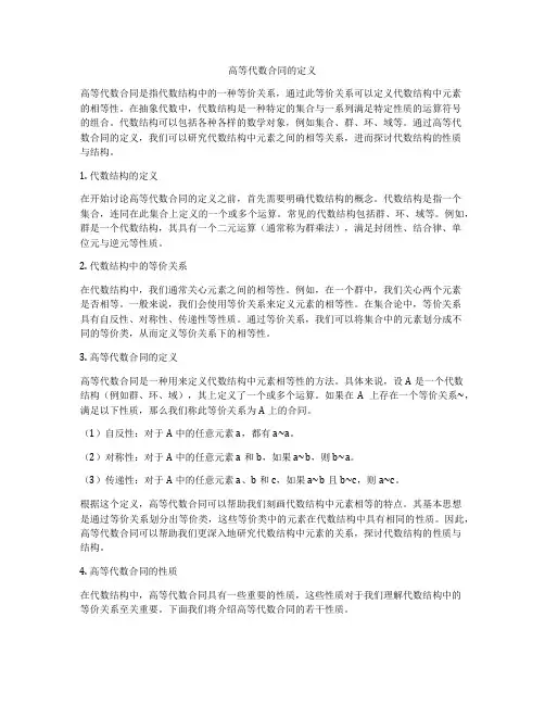 3. 高等代数合同的定义高等代数合同是一种用来定义代数结构中元素相等性的方法。