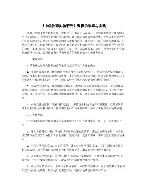 一、实践内容中学物理实验研究课程的改革主要包括以下几个方面的内容:1. 实验内容的更新:传统的物理实验内容以定性实验为主,缺乏对物理原理的深入理解。