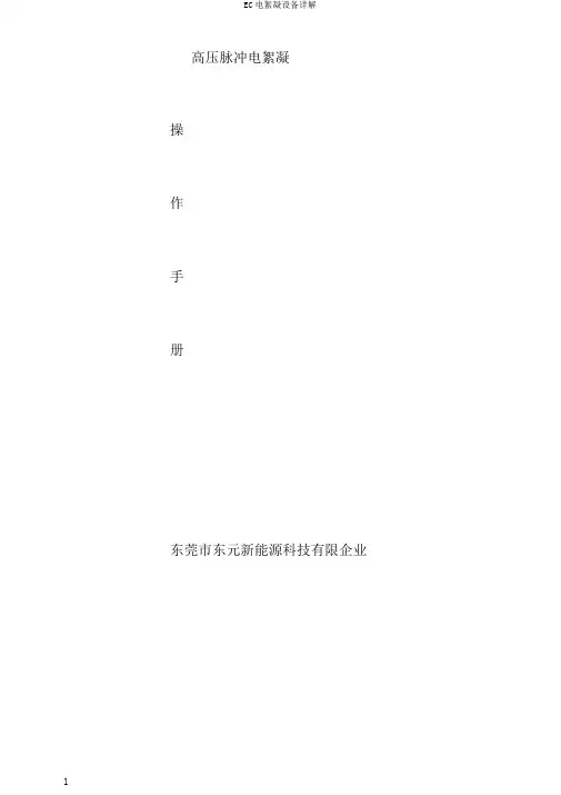 高压脉冲电絮凝操作手册东莞市东元新能源科技有限公司目录一、电絮凝工艺概述 (1)1.1 电絮凝工艺原理 (1)1.2 电絮凝工艺特点 (4)1.3 电絮凝工艺的应用与发展 (4)二、标准化电絮凝设备的设计思想、依据与原则 (5)2.1、设计思想 (5)2.2、设计依据 (5)2.3、设计原则 (5)三、标准化电絮凝设备的构成、特征与优势 (6)3.1、标准化电絮凝设备的构成 (6)3.2、标准化电絮凝设备的特点与优势 (7)四、标准化电絮凝设备规格与参数 (8)4.1 流量调节装置 (8)4.2 电解反应器 (8)4.3 分离装置 (9)4.4 直流电源 (9)4.5 控制系统 (9)五、标准化电絮凝设备的运行管理 (10)5.1 安装及运行基本要求 (10)5.2 日常运行维护 (11)5.3 设备检修 (11)5.4 特殊问题 (12)六、工程概算 (12)6.1、编制依据 (12)6.2、设备投资估算表 (12)6.3、总投资估算 (13)七、运行费用 (13)八、需要说明的问题 (13)一、电絮凝工艺概述1.1 电絮凝工艺原理电絮凝是利用可溶性金属阳极在电解过程中产生的金属氢氧化物絮凝去除水中污染物质的水处理工艺。