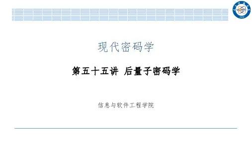 现代密码学第五十五讲后量子密码学信息与软件工程学院第五十七讲后量子密码学量子计算对密码学的影响后量子密码学的研究方向量子计算对密码学的威胁•贝尔实验室,Grove算法,1996年•针对所有密码(包括对称密码)的通用的搜索破译算法•所有密码的安全参数要相应增大•贝尔实验室,Shor算法,1994年•多项式时间求解数论困难问题如大整数分解问题、求解离散对数问题等•RSA、ElGamal、ECC、DSS等公钥密码体制都不再安全量子计算对密码学的威胁(续)密码算法类型目的受大规模量子计算机的影响AES对称密钥加密密钥规模增大SHA-2, SHA-3Hash函数完整性输出长度增加RSA公钥密码加密,签名,密钥建立不再安全ECDSA,ECDH公钥密码签名,密钥交换不再安全DSA公钥密码签名不再安全量子计算机的研究进展•2001年,科学家在具有15个量子位的核磁共振量子计算机上成功利用Shor算法对15进行因式分解。