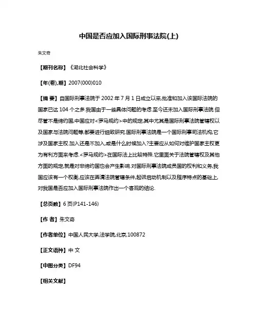 朱文奇(中国人民大学法学院,北京100872)摘要:自国际刑事法院于2002年7月1日成立以来,批准和加入该国际法院的国家已达104个之多。