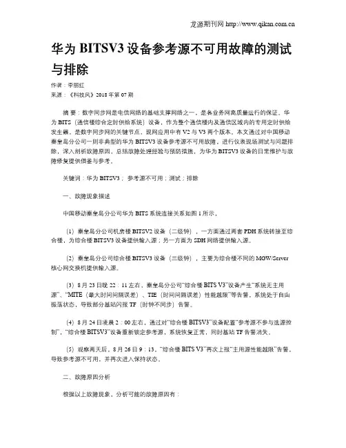 关键词:华为BITSV3;参考源不可用;测试;排除一、故障现象描述中国移动秦皇岛分公司华为BITS系统连接关系如图1所示,(1)秦皇岛分公司机房楼BITSV2设备(二级钟),一方面通过两套PDH系统转接至综合楼,为综合楼BITSV3设备提供输入源;另一方面为SDH网络提供输入源。