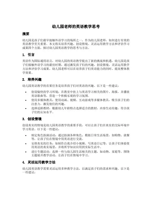 幼儿园老师的英语教学思考摘要幼儿园是孩子们最早接触外语学习的场所之一,作为幼儿园老师,如何进行有效的英语教学至关重要。