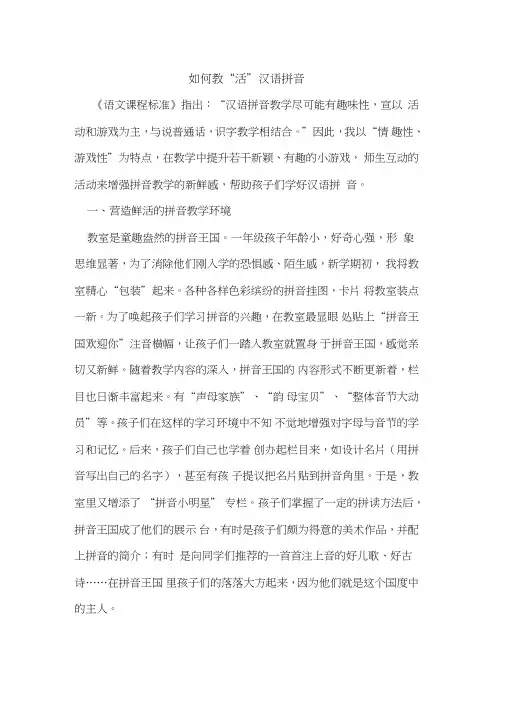 营造“活”的拼音教学课堂汉语拼音是小学语文教学的重要内容,更是学好语言文学的基础和支柱。