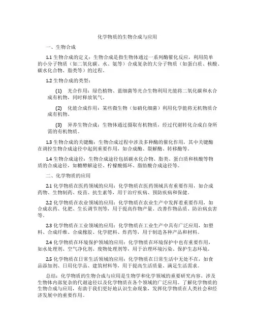 化学物质的生物合成与应用一、生物合成1.1 生物合成的定义:生物合成是指生物体通过一系列酶催化反应,利用简单的小分子物质(如二氧化碳、水、氨等)合成复杂的大分子物质(如蛋白质、核酸、碳水化合物、脂类等)的过程。