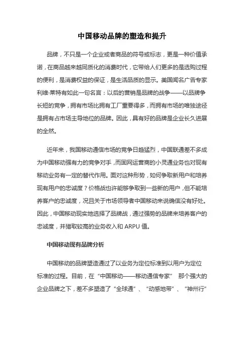 浅谈中国移动品牌战略及策略中国移动品牌战略及策略近年来,中国移动通信市场竞争激烈,各大运营商纷纷调整品牌战略,以求在市场中占有一席之地。